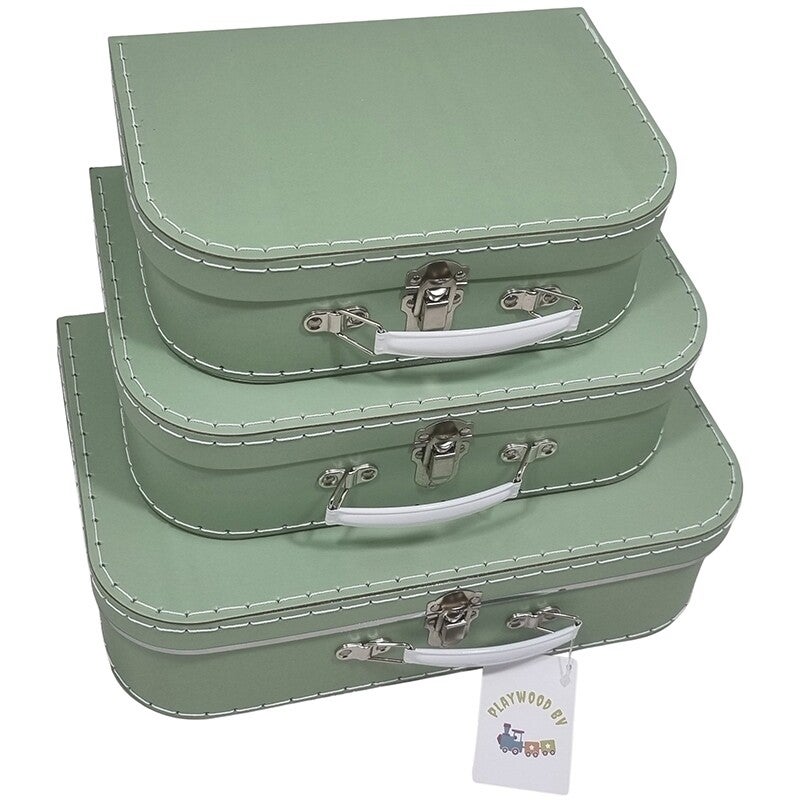 Dit item bestaat uit een kartonnen kinderkoffertje, dat is genaaid met draad en voorzien is van enkele metalen details en een metalen handvat. Het kinderkoffertje wordt bedrukt en standaard gepersonaliseerd.